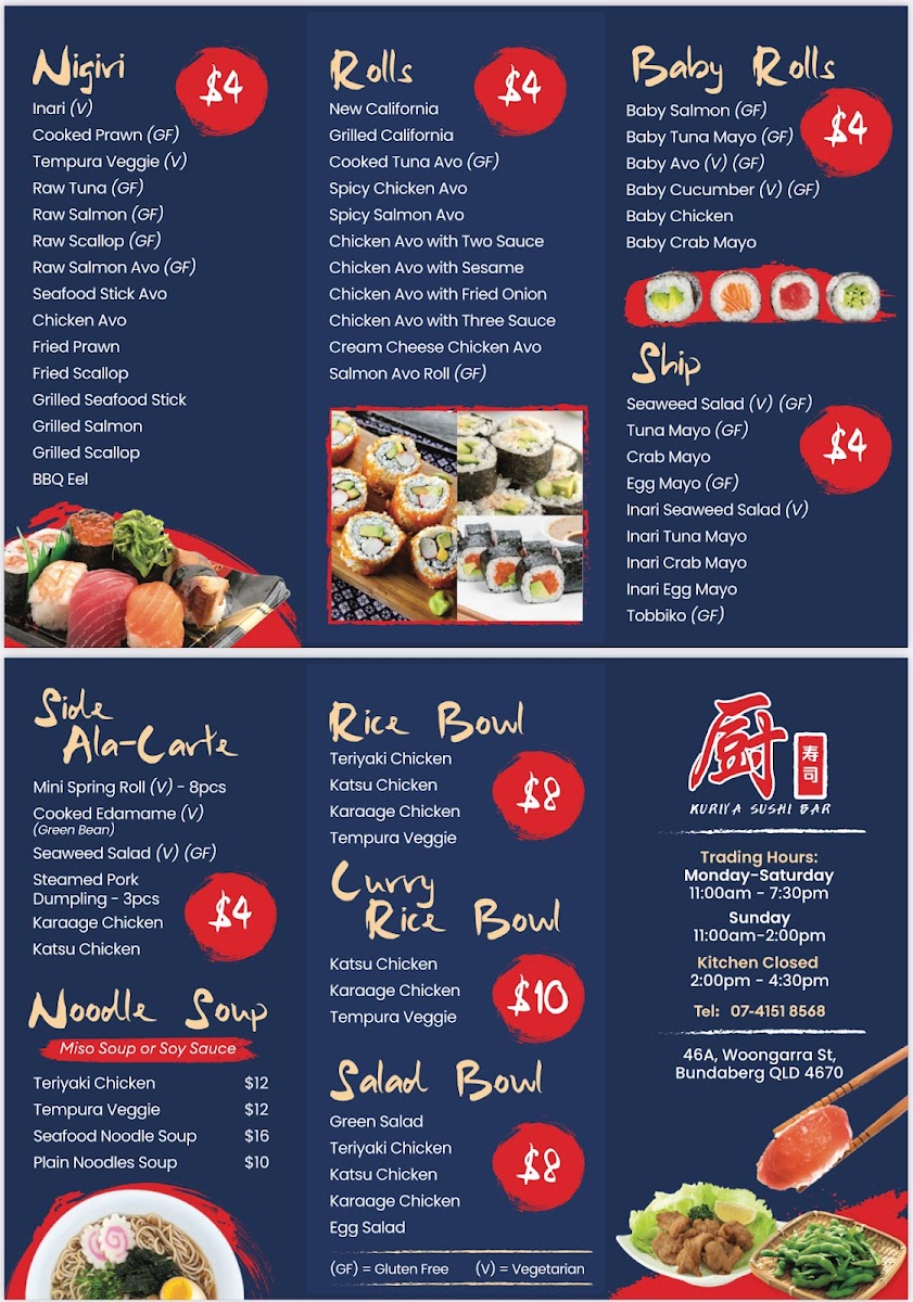 Introducing the menu at Kuriya Sushi Bar, located at 46 Woongarra St, Bundaberg Central, QLD, is a culinary journey into the heart of Japanese cuisine. Renowned for its fresh sushi and affordable prices, Kuriya excels in offering a variety of delicious dishes that cater to all palates.